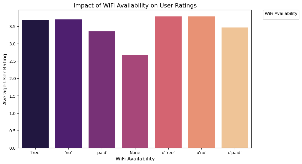 - wifi_‘free’ (0.2189): Offering free Wi-Fi is positively associated with higher average ratings.