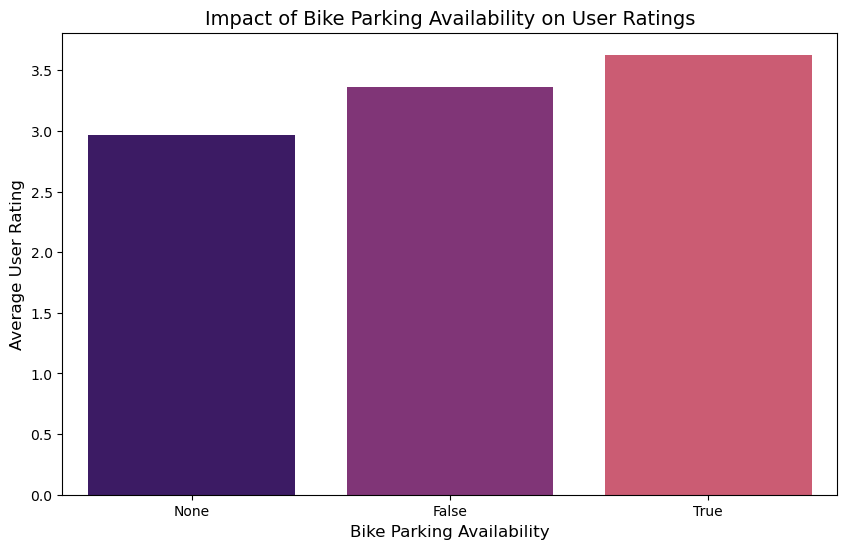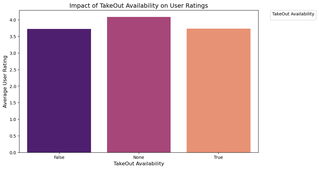 takeout_True (0.1444): Conversely, offering takeout is associated with a 0.1444 point increase in average ratings, reinforcing the positive impact of this service on customer satisfaction.