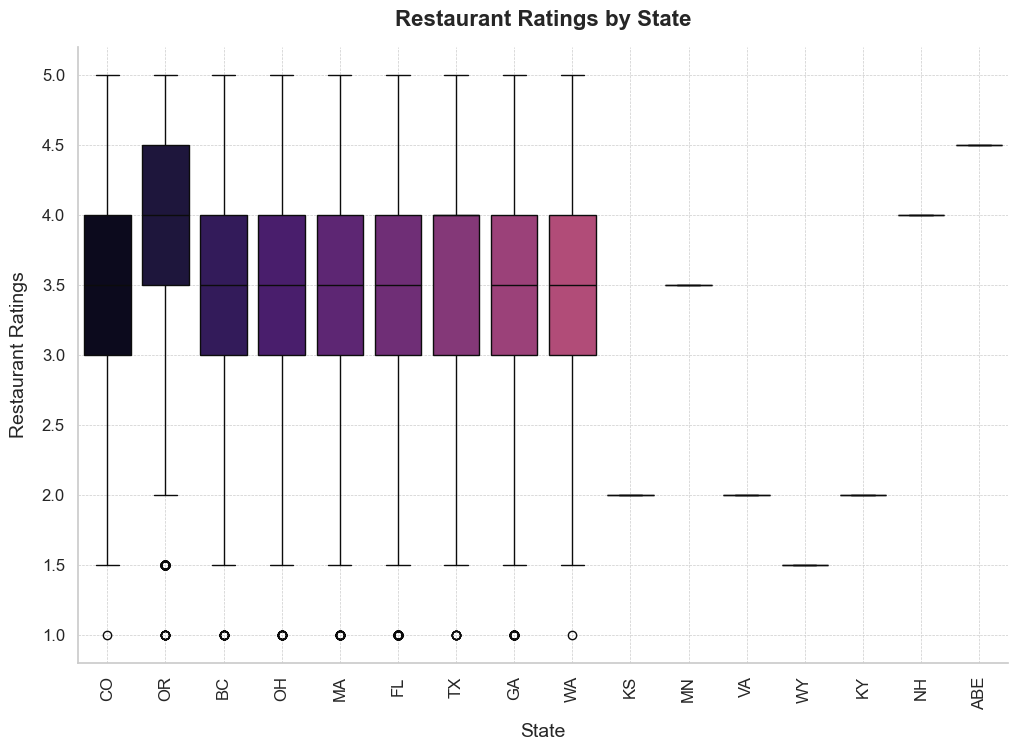 avg_useful (0.0247): For every unit increase in the average usefulness score of reviews, the restaurant’s average rating is expected to increase by 0.0247. This suggests that more useful reviews are positively associated with higher average ratings, and the effect is statistically significant (p < 0.05).